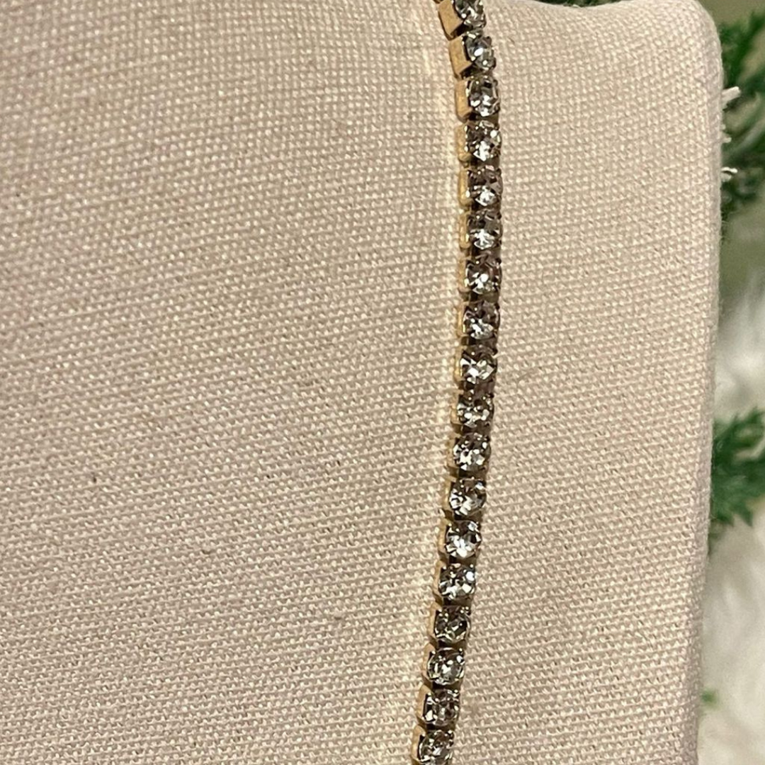 Gargantilla dorada con circonitas tipo diamante. Disponible en dos tamaños: mini y mediana. Delicada, luminosa y perfecta para llevar sola o combinada.