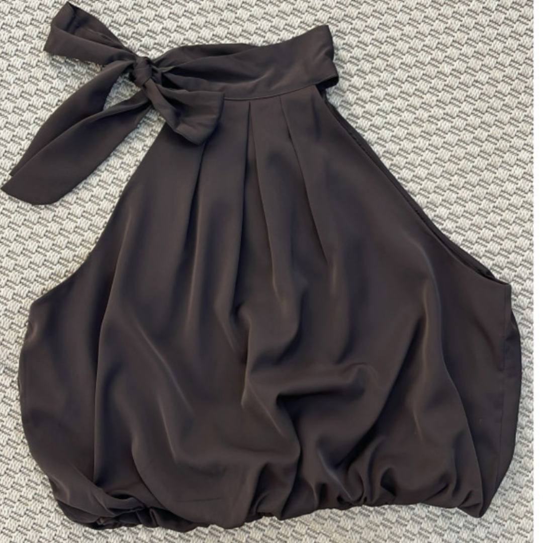 Su tejido fluido y ligero aporta una caída suave, mientras que la parte inferior abombada crea un efecto globo, dando volumen y un acabado diferente al diseño. Este detalle hace que el top no quede pegado al cuerpo y resulte cómodo y estiloso.