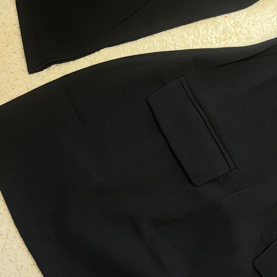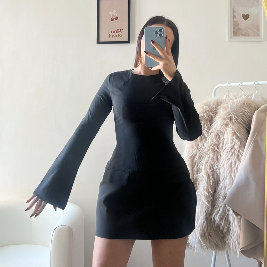 Vestido negro de tejido elástico que se adapta a la figura, realzando la silueta de forma cómoda y favorecedora. Cuenta con unas mangas largas que se abren en forma acampanada, aportando un toque moderno y sofisticado. En la parte frontal incluye dos pequeños bolsillos decorativos que añaden un detalle sutil y estiloso. Es una prenda versátil, ideal tanto para un look de noche como para ocasiones especiales en las que quieras verte elegante sin renunciar a la comodidad.
